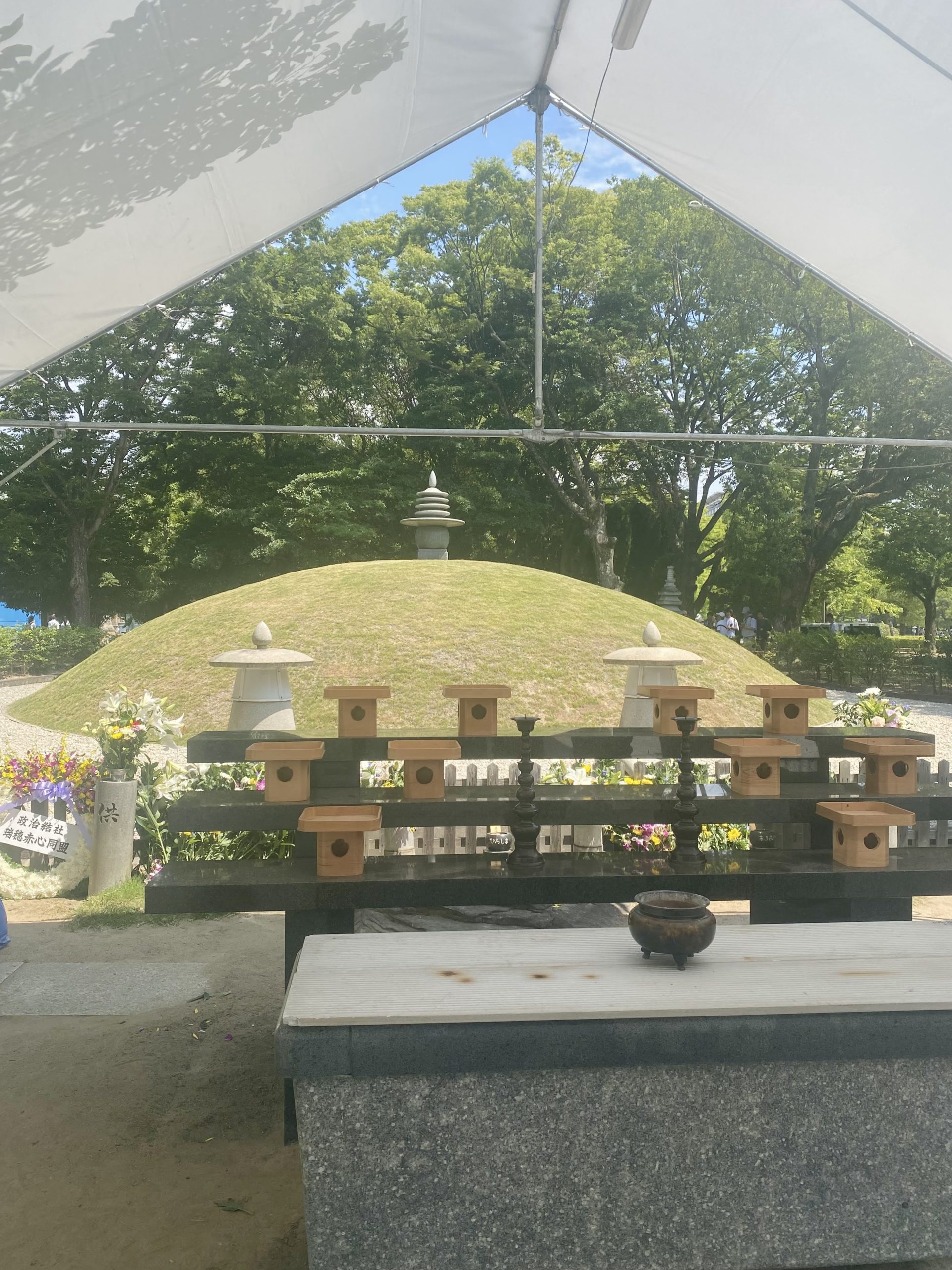 The Atomic Bomb Memorial Mound in Hiroshima holds the ashes of thousands of unknown victims. It is a place of remembrance where interfaith commemorations are often held, promoting peace and the hope to prevent future nuclear tragedies. Many are the commemorations and events happening around the park. Many are also praying.