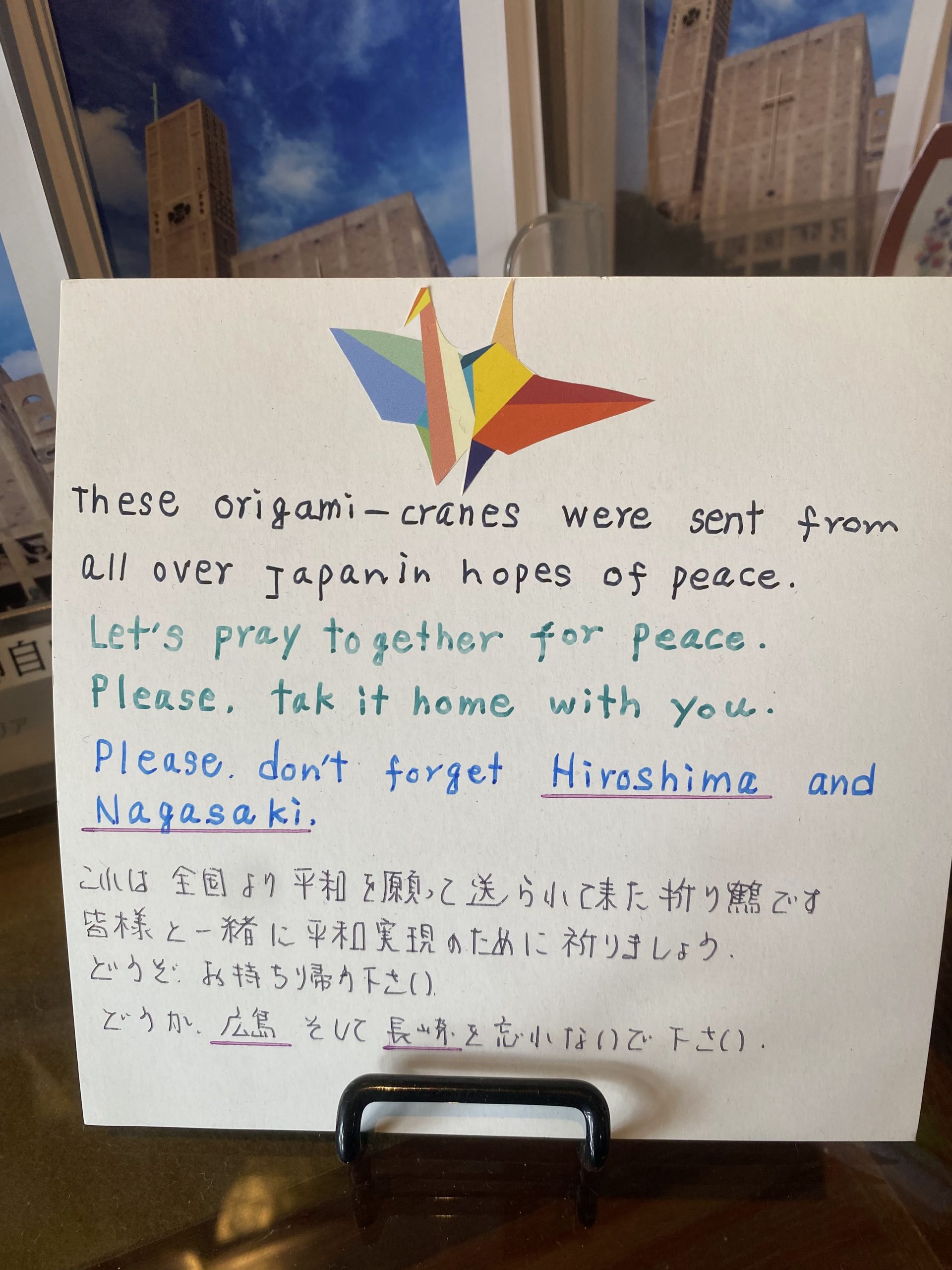 “This church was erected in memory of the victims of the first atomic bomb, dropped on Hiroshima on 6 August 1945, and as a sign of peace for all nations, symbolizing the true and only way that leads to peace with God and man: the way of truth, not of deception; of justice, not of violence; of love, not of hate. Therefore all who enter this church are earnestly requested to offer their prayers for the eternal repose of the departed and for peace among the peoples of the world. The sixth day of August in the year 1954.”