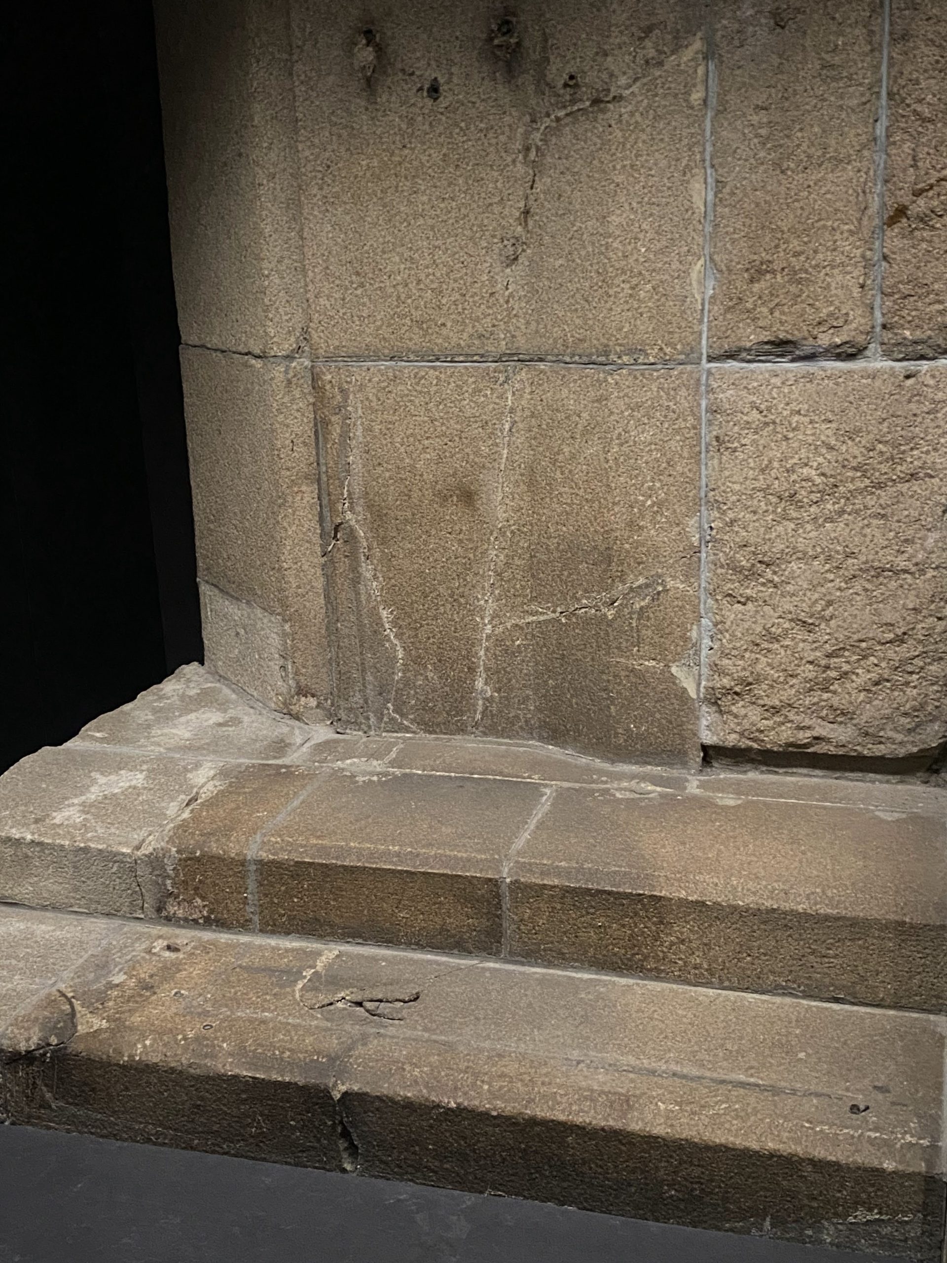 These stone steps were at Hiroshima’s Sumitomo Bank entrance. A person sitting there during the blast died instantly. The intense heat turned the steps white, but the spot beneath them stayed dark, like a shadow.