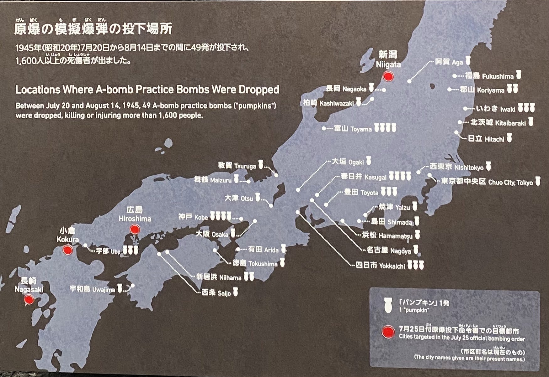 To prepare for the use of the atomic bomb in combat, a special bomb unit was organized, and a series of training sessions was conducted in a desert in the United States. In 1945, the unit moved to Tinian, one of the Mariana Islands. For more realistic training and to help bombardiers familiarize themselves with local geography, A-bomb practice bombs (called “pumpkins”) were dropped on Japanese cities.