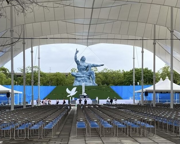 The Peace Statue‘s right hand indicates the threat of nuclear weapons, while the left one symbolises peace, and his closed eyes express prayerfulness for those who are victims of war. The Peace Park is preparing to host tomorrow’s commemoration ceremony.