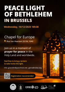 In Brussels we receive the light, brought to us by the scouts and guides, on Wednesday 10. December, 18.30h at the Parc Léopold (in front of the House of European History, near Place Jean Rey). From there we accompany the light to the Chapel for Europe, where we will share a moment of reflection and prayer for peace in the Holy Land and worldwide. The peace light will then be distributed to all who want to carry it on to their parishes, communities, houses and so on.