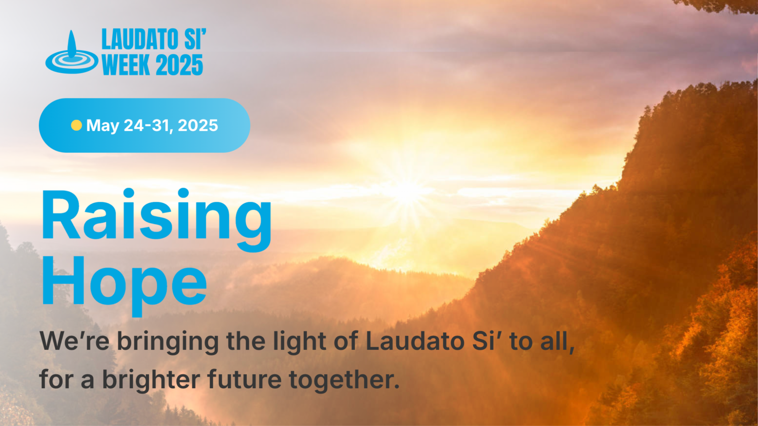 The theme for Laudato Si’ Week 2025 is “Raise Hope,” a call to action and joy. As we mark a decade of prayer and action, we are invited to spread the message of Laudato Si’ by reaching people who may not yet know its message. Let this be a time of sharing light, building community, and planting seeds for a sustainable and nonviolent future.